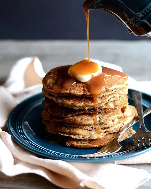 4) Serve pancakes with lots of butter, spiced caramel sauce or maple syrup. Yum!