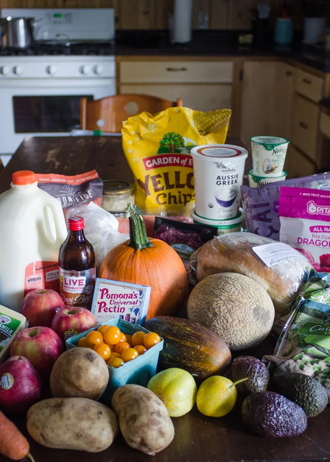 To round out my haul I got some root beer kombucha (this stuff is so yummy!), Bubbies sauerkraut, pectin to make jelly from wild grapes we picked at our land, white rice, tortilla chips, and some sourdough bread from the farmers market.