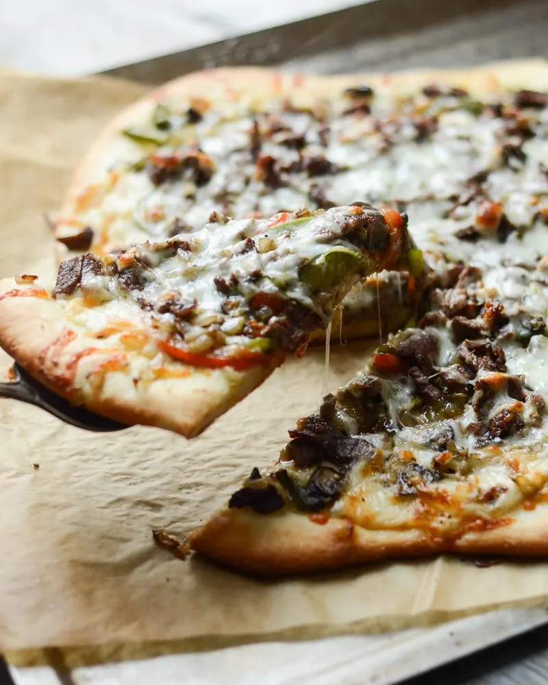 A delicious pizza with all the flavors of a Philly Cheese Steak!